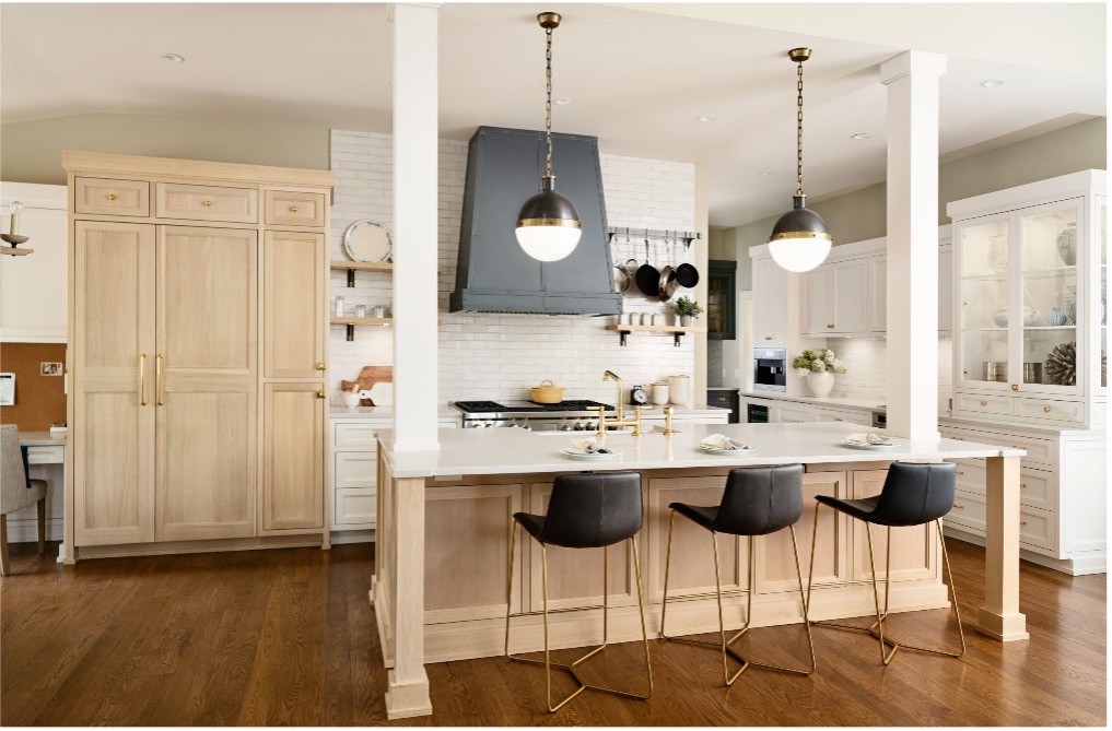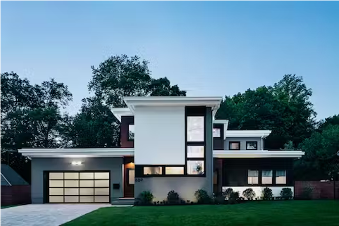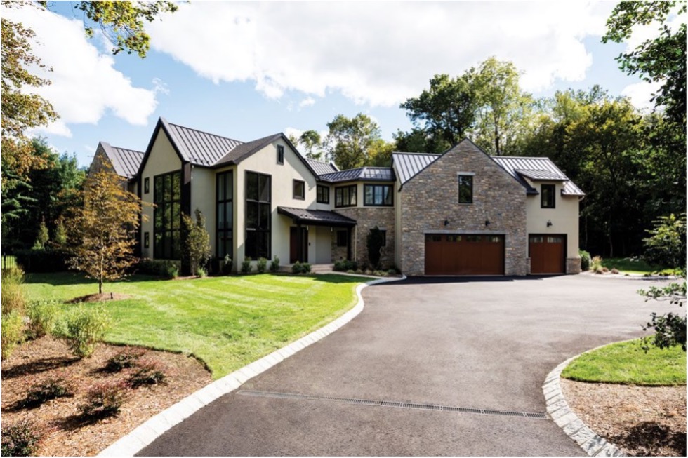 When a couple has two different design tastes, but is open to something totally unique – you get something a bit like this. The traditional gable form, roofline, and a bold chimney hold down the center of the home in a more transitional style, while singular sloped roofs and abstracted