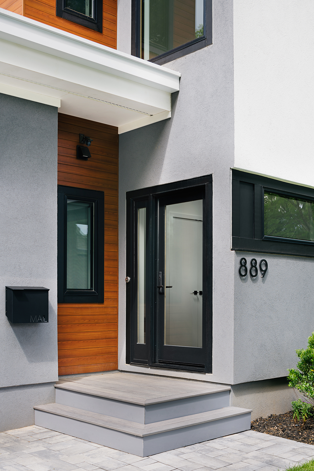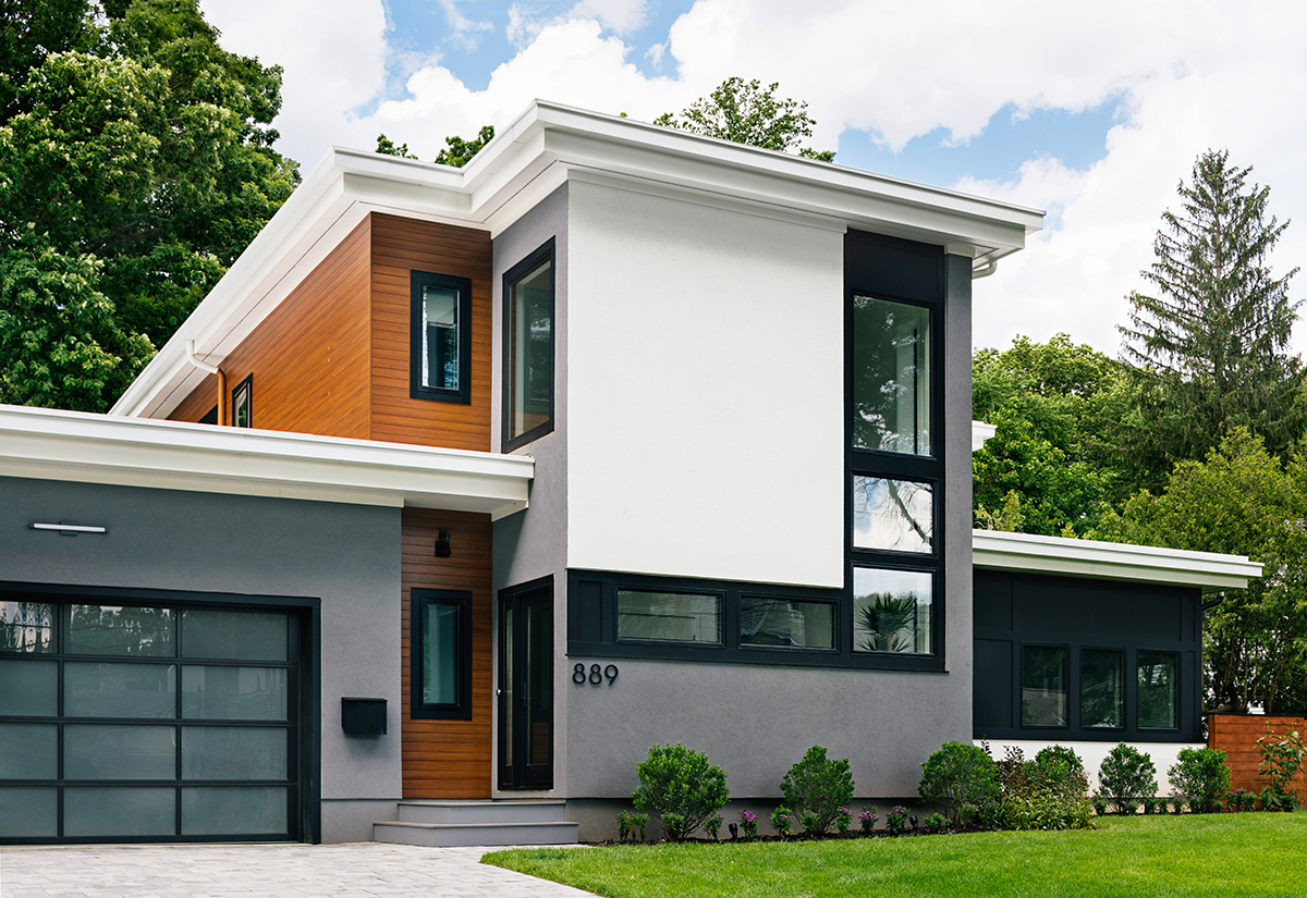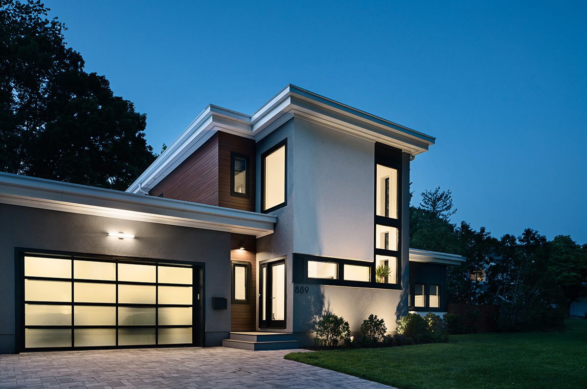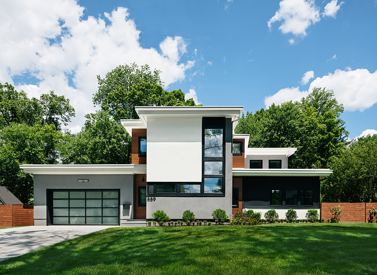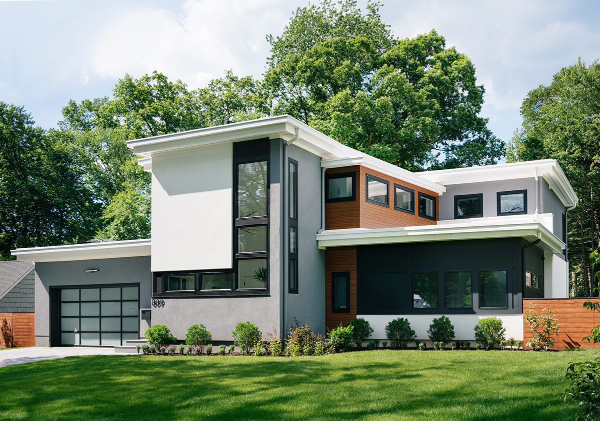 New residence in place of original Colonial dwelling. The front façade maintains the scale and proportion of adjacent homes in a Colonial and Tudor-inspired neighborhood, while the forms and materials reinforce the West Coast aesthetic that was important for the family to keep when they relocated. The exterior design is seamlessly integrated with the interior aesthetic and the private rear yard and pool.