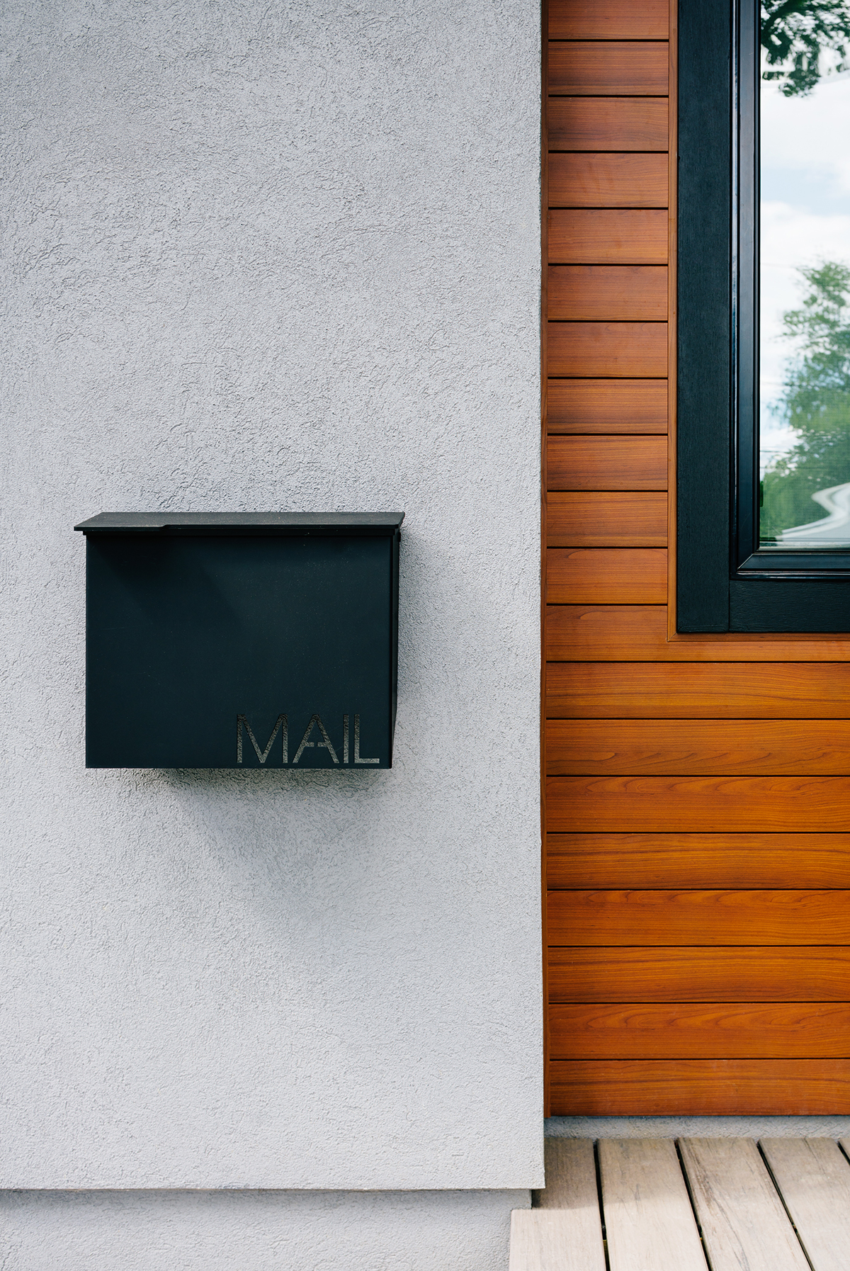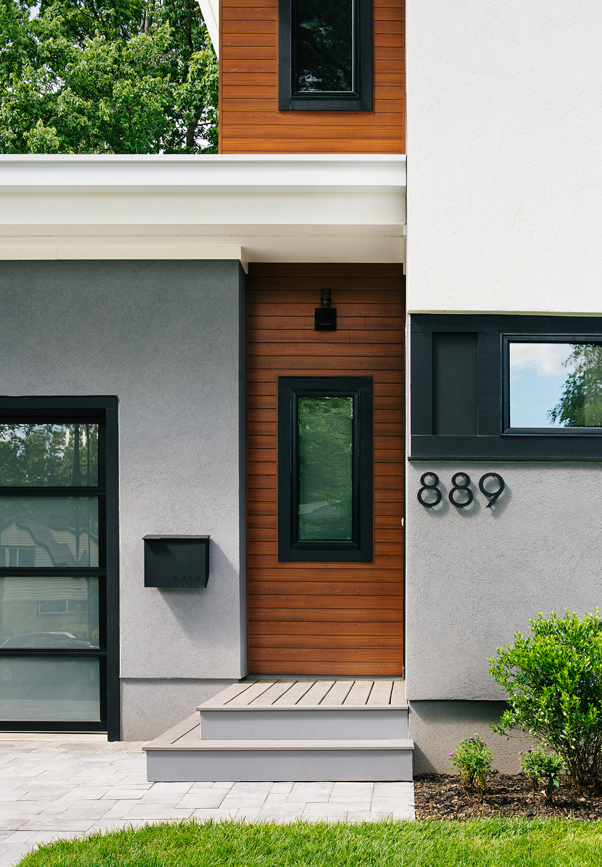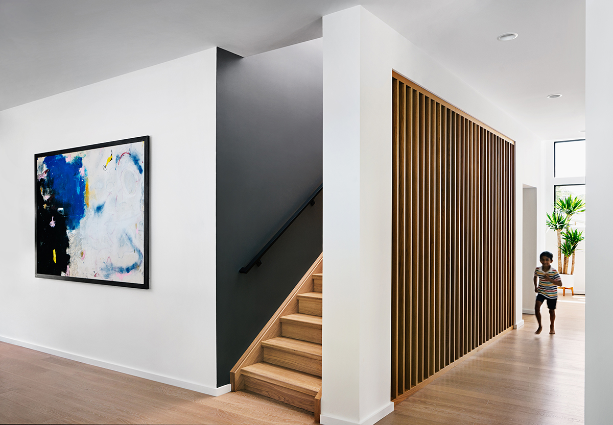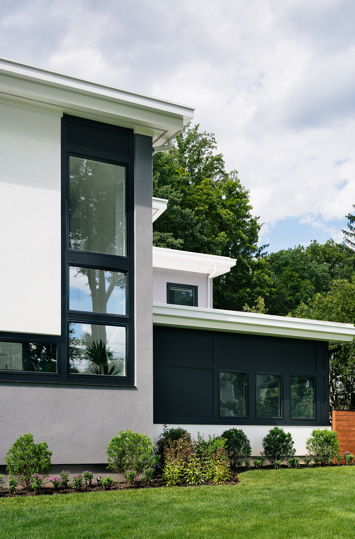 New residence in place of original Colonial dwelling. The front façade maintains the scale and proportion of adjacent homes in a Colonial and Tudor-inspired neighborhood, while the forms and materials reinforce the West Coast aesthetic that was important for the family to keep when they relocated. The exterior design is seamlessly integrated with the interior aesthetic and the private rear yard and pool.