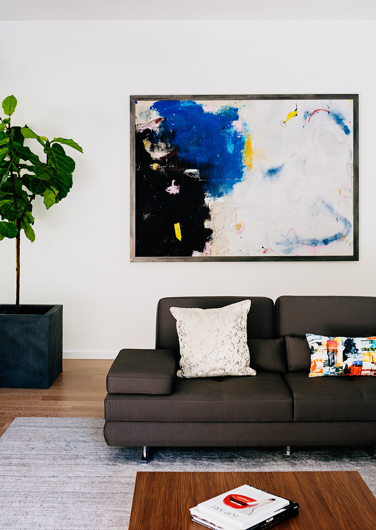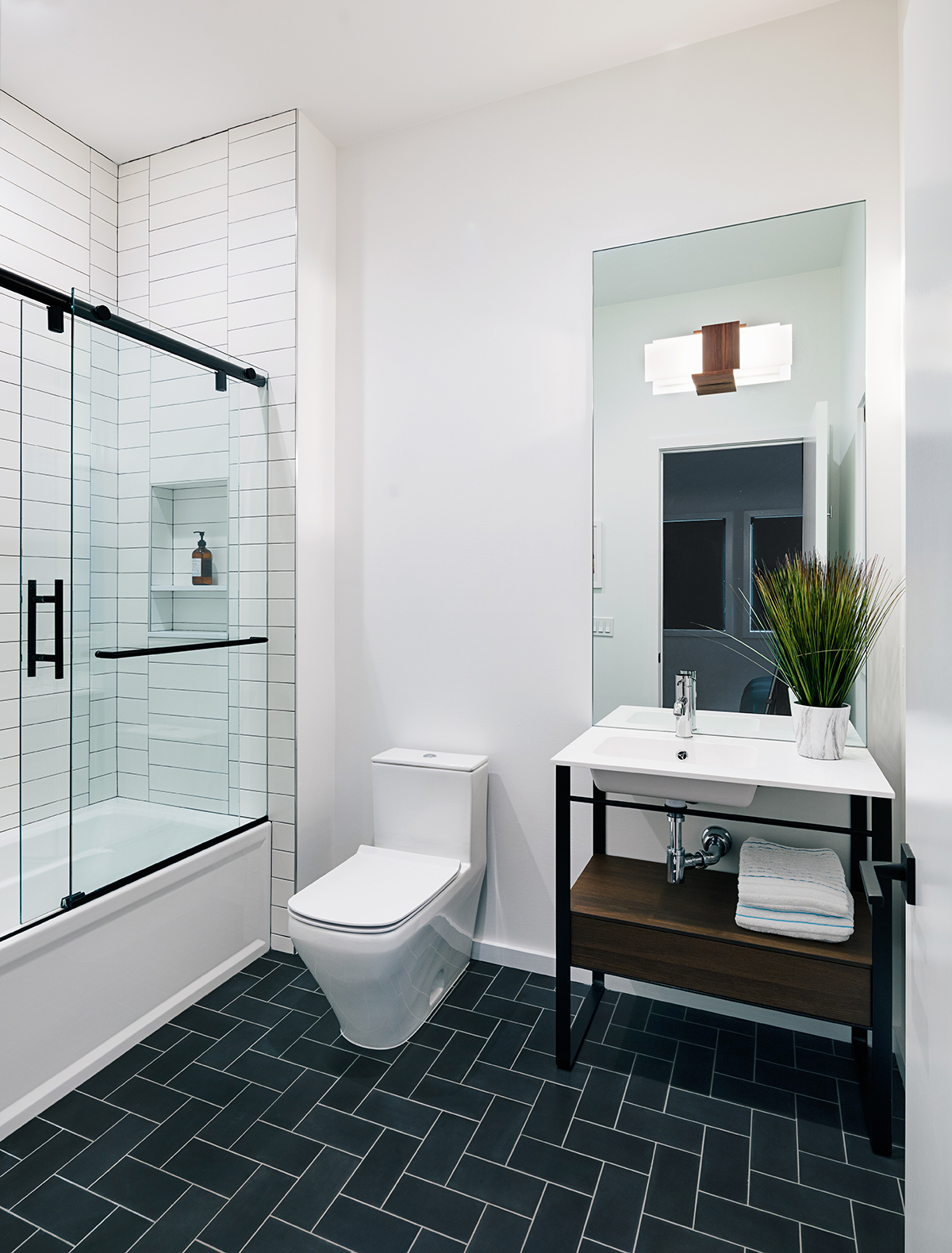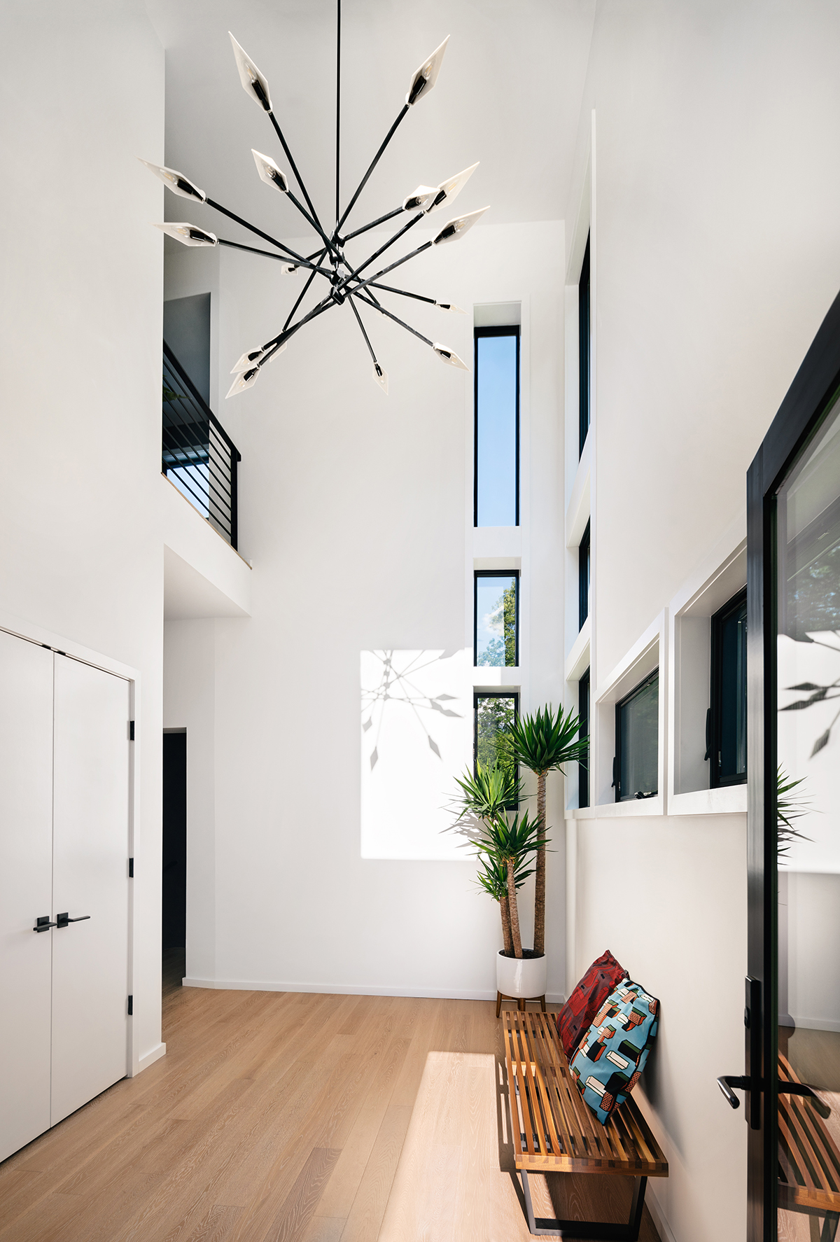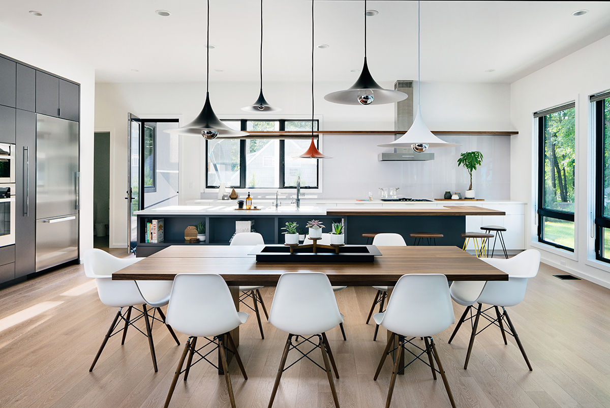 New residence in place of original Colonial dwelling. The front façade maintains the scale and proportion of adjacent homes in a Colonial and Tudor-inspired neighborhood, while the forms and materials reinforce the West Coast aesthetic that was important for the family to keep when they relocated. The exterior design is seamlessly integrated with the interior aesthetic and the private rear yard and pool.