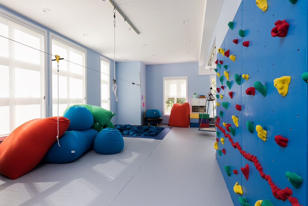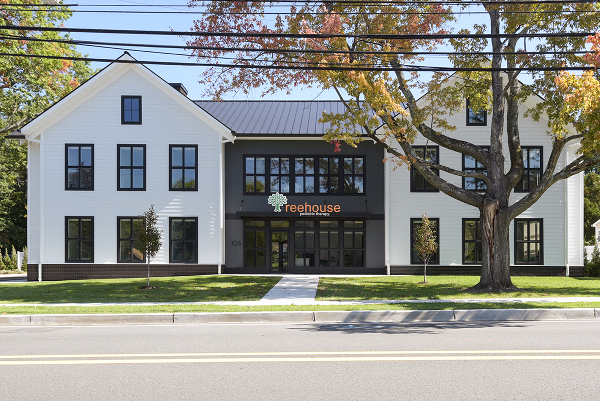 New construction. Balancing the look of a professional business with a scaled, residential form aesthetic of the surrounding neighborhood, the design sought to create a welcoming, safe, and comfortable environment for kids to engage in speech-language and occupational therapy services.